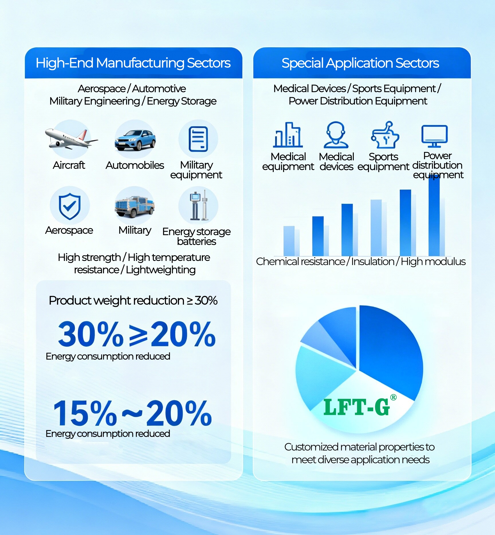 LFT composite materials offer outstanding performance and are widely used in high-end manufacturing sectors (such as aerospace and automotive) as well as specialized applications (such as medical equipment).